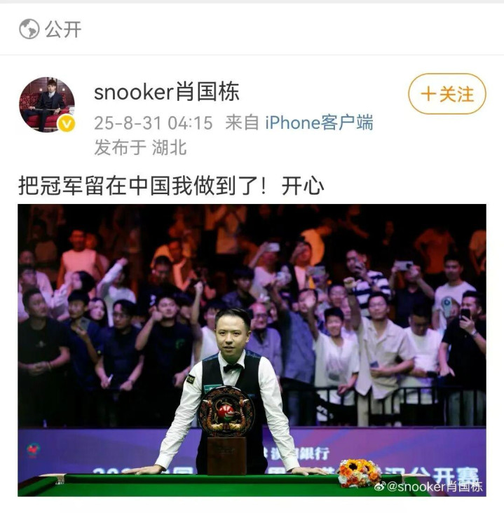 8月30日,在2025世界斯诺克武汉公开赛决赛中,肖国栋以10∶9艰难战胜英国选手加里·威尔逊,卫冕武汉公开赛冠军。这是肖国栋的第二个排名赛冠军。夺冠后他的世界排名提升到第八位,创职业生涯新高。